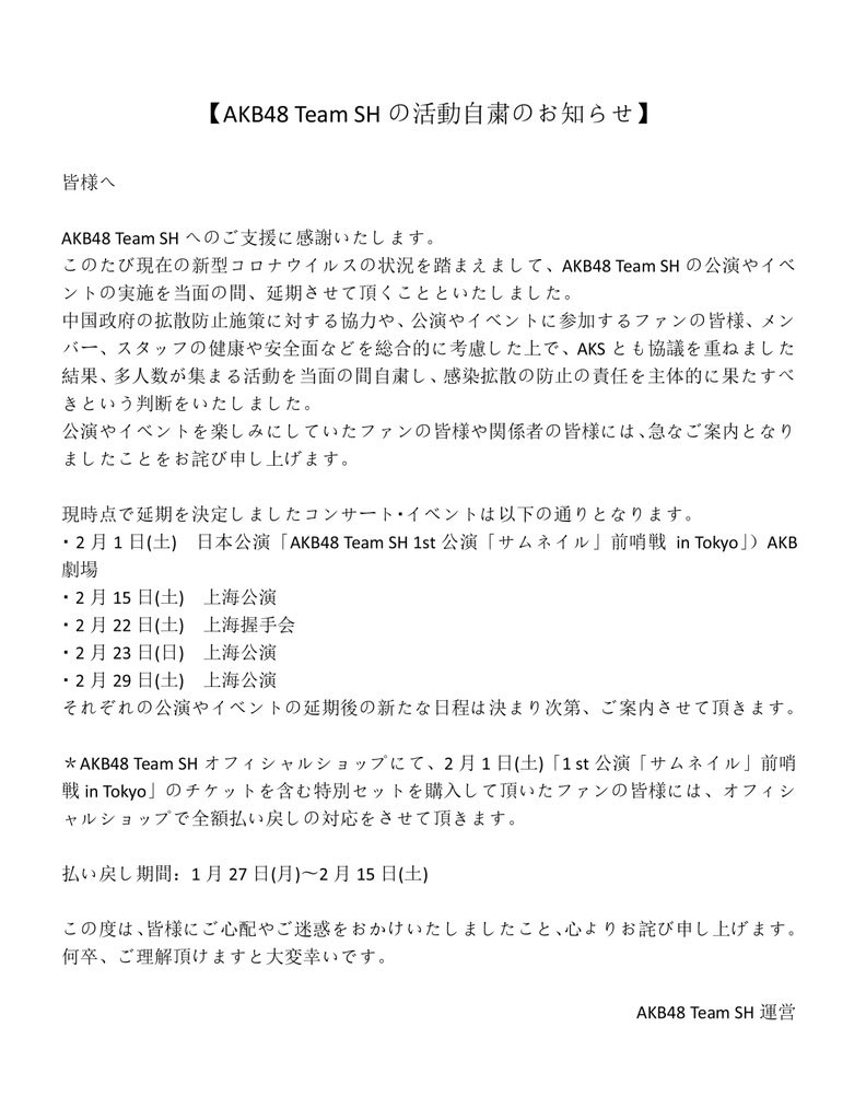 「新型コロナウイルスの流行に伴い、2月の劇場公演と2月22日の握手会は、大きなリスクがあると判断された場合には延期またはキャンセルされる可能性があります。そのような状況になった場合は迅速にお知らせします。」という発表がありました。このままの状況なら間違いなく中止でしょう。今後も定期的にやるわけですから大した問題ではないです。2月1日の東京公演はちょっと延期とかそんな簡単な話ではないから心配です。とはいえ、希望的観測が入ってますが大丈夫かと。抽選で当たる気がしないので、必死になって中国側チケットをなんとか手に入れたのに、中止になったら本当にショック。